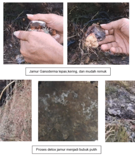 Muncul secara signifikan akar-akar dan pucuk baru. Ditemukan serbuk putih menyerupai tepung di sekitar batang tanaman. Sebagian jamur Ganoderma patah secara alami, dan sisanya mudah dipatahkan karena sudah mengering