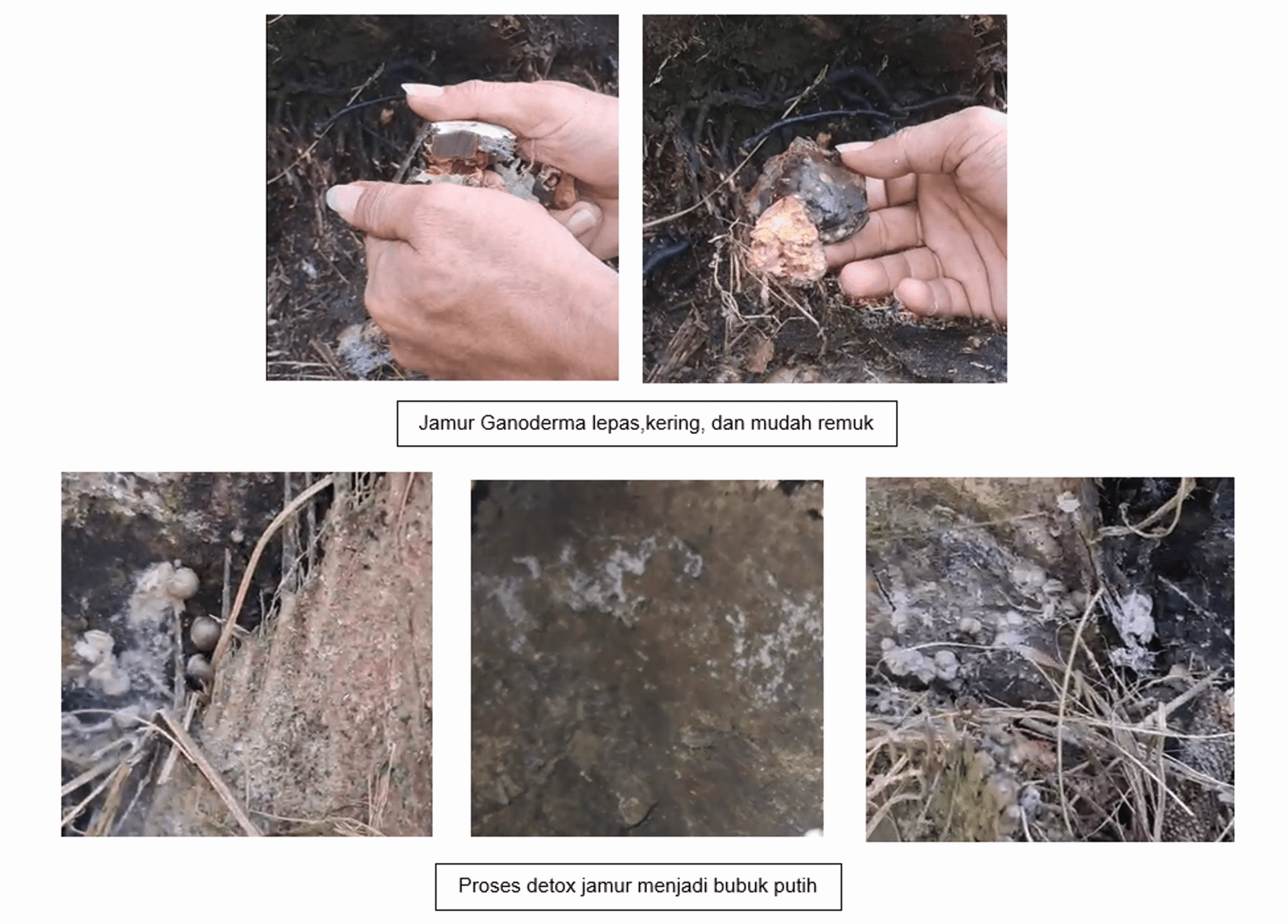 Muncul secara signifikan akar-akar dan pucuk baru. Ditemukan serbuk putih menyerupai tepung di sekitar batang tanaman. Sebagian jamur Ganoderma patah secara alami, dan sisanya mudah dipatahkan karena sudah mengering